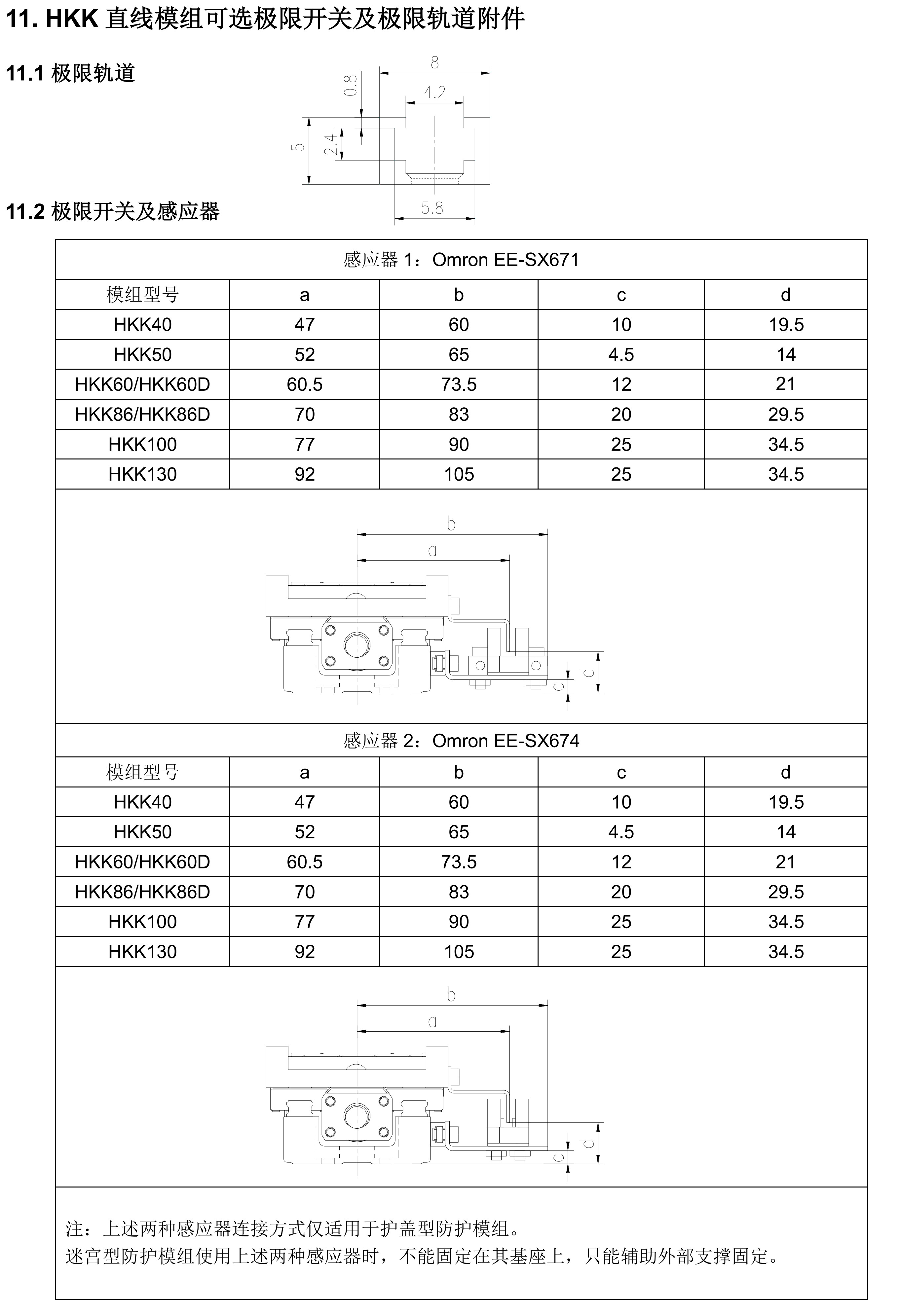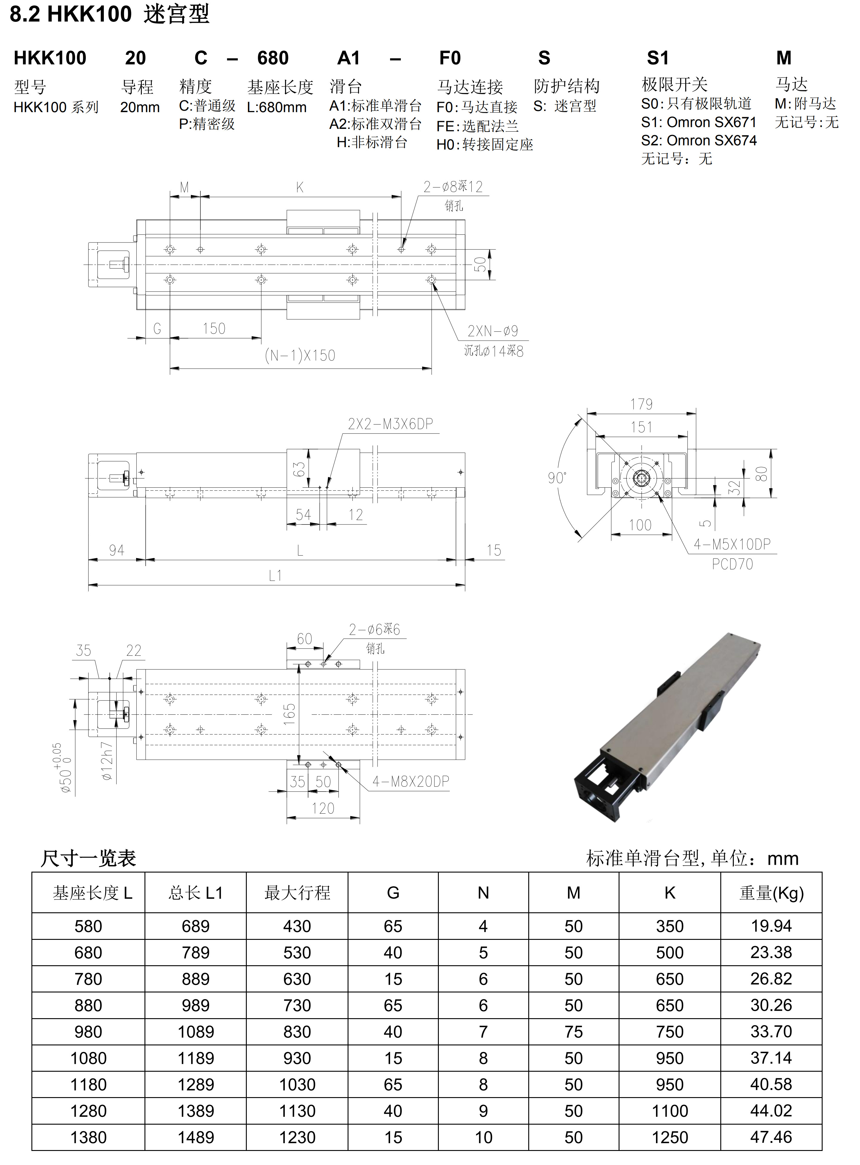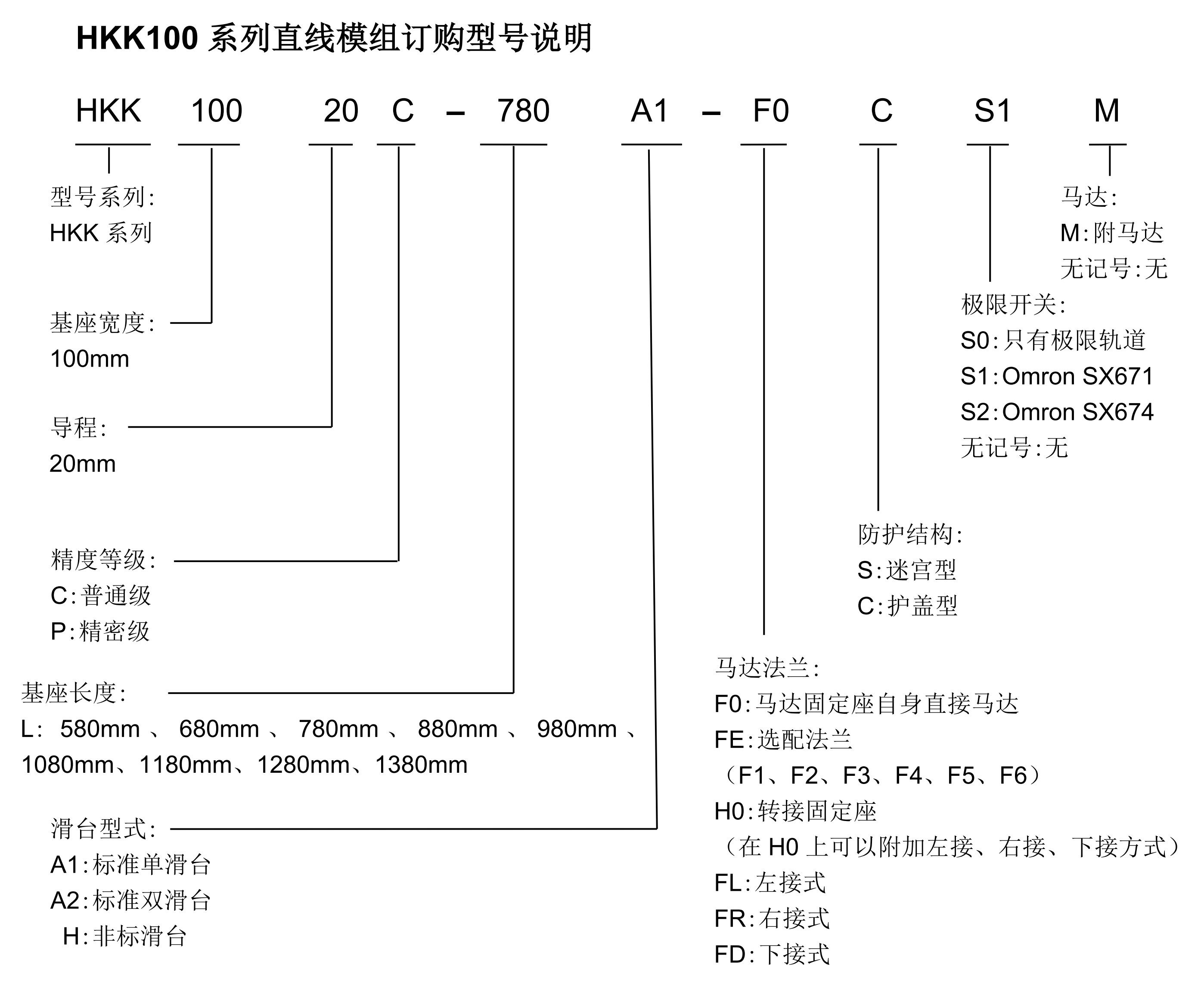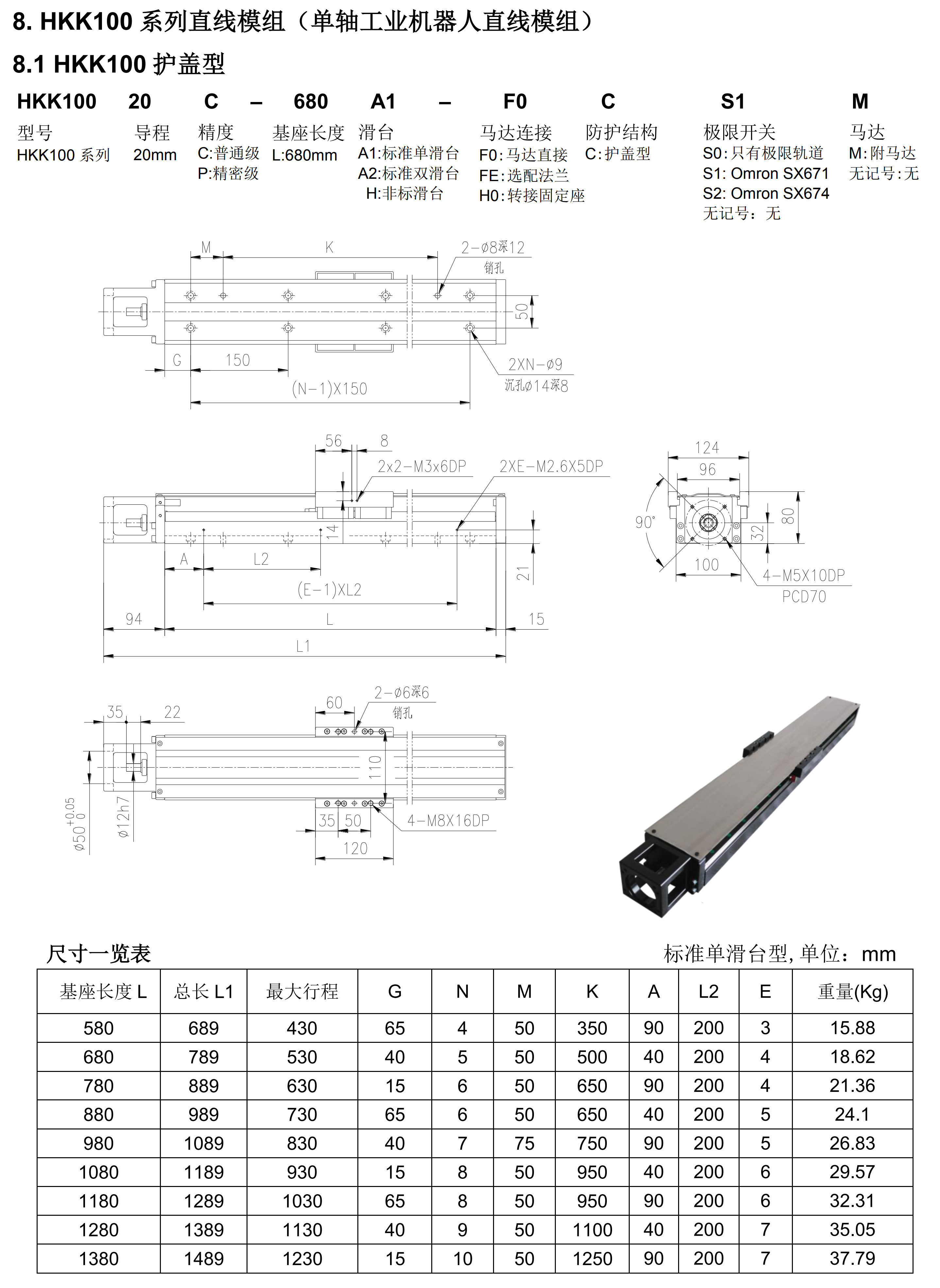 公司專業(yè)生產(chǎn)的線性模組(直線模組,直線滑臺),安裝尺寸國際通用,精選臺灣進(jìn)口上銀滾動直線導(dǎo)軌和TBI滾珠絲杠搭建,質(zhì)量優(yōu),供貨快。HKK系列線性模組為鋼基座,寬度范圍40mm到130mm,承載能力遠(yuǎn)遠(yuǎn)超出臺灣上銀KK系列,PMI之KM系列,日本THK之KR/SKR等同尺寸替代線性模租。HKK100系列標(biāo)準(zhǔn)長度有580、680、780、880、980、1080、1180、1280、1380。