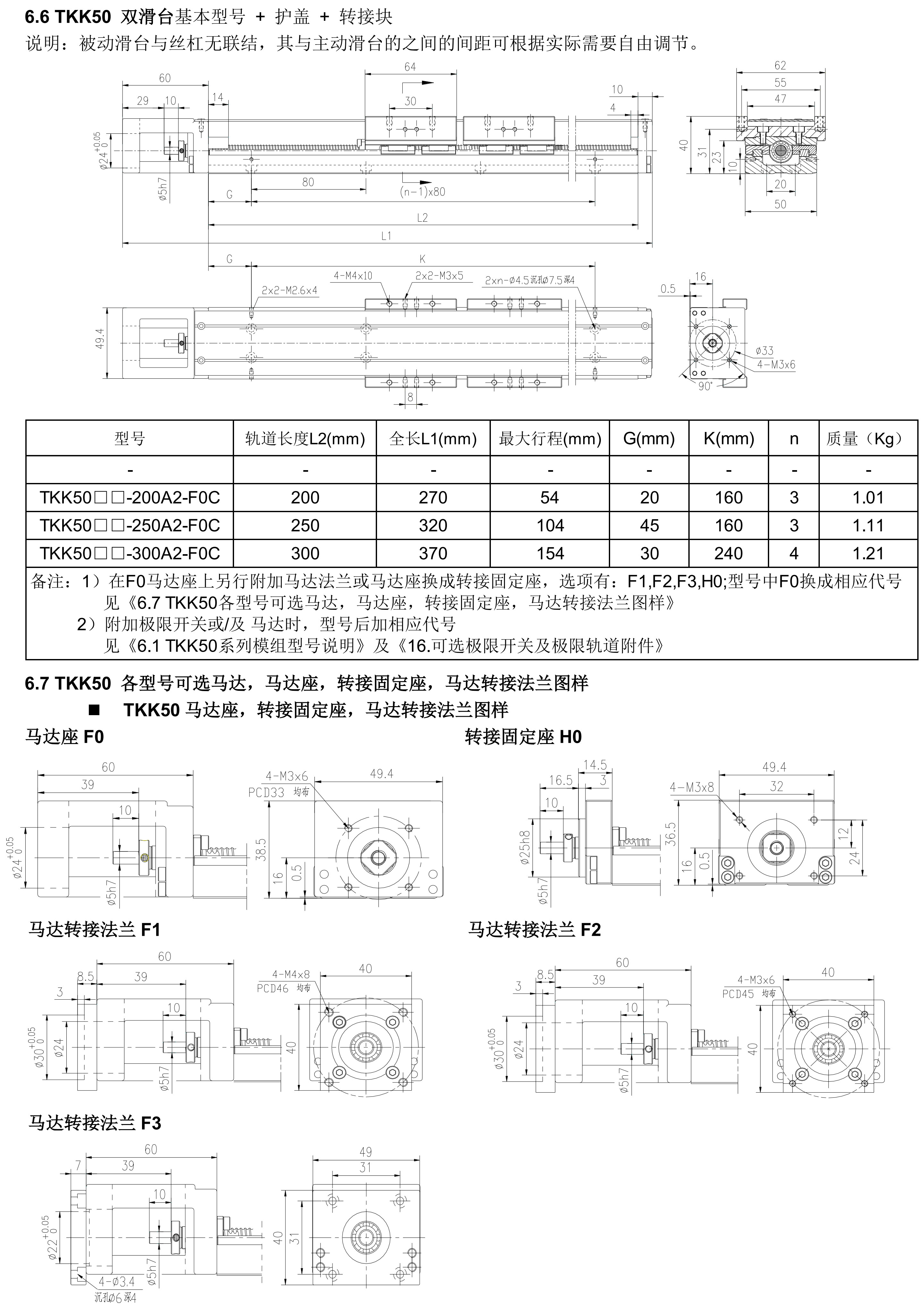 TKK系列線性模組為鋁制基座,寬度范圍40mm到130mm,可完全替代臺灣上銀KK系列,PMI之KM系列,日本THK之KR/SKR等線性模,整體重量更輕。TKK50系列軌道長度:150、200、250、300。