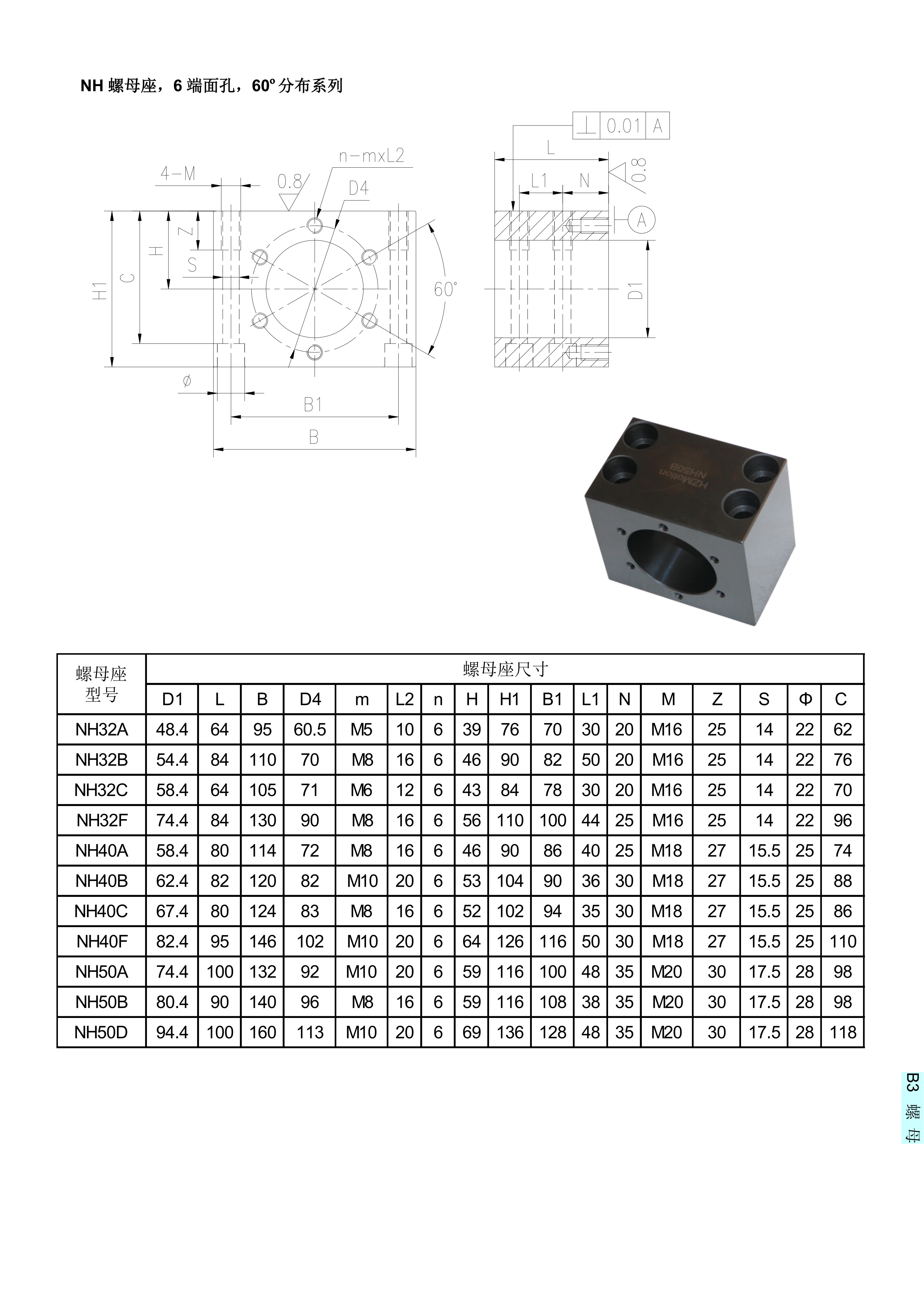 公司研發(fā)和生產(chǎn)全型號(hào)世界著名廠商的滾珠絲杠專(zhuān)用螺母承座,特別是MGD/MGS系列,其安裝尺寸完全匹配標(biāo)準(zhǔn)化軋制滾珠絲杠螺母。各產(chǎn)品型號(hào)與臺(tái)灣嵩陽(yáng)SYK,日本THK,日本NSK,MISUMI,德國(guó)Rexroth相應(yīng)型號(hào)通用。NH系列為我公司國(guó)際首創(chuàng),在匯總了國(guó)際著名滾珠絲杠生產(chǎn)商螺母標(biāo)準(zhǔn)的基礎(chǔ)上,推出了各廠商間通用的螺母座安裝尺寸。MH螺母座,6端面孔,60°分布系列具體型號(hào):NH32A、NH32B、NH32C、NH32F、NH40A、NH40B、NH40C、NH40F、NH50A、NH50B、NH50D.