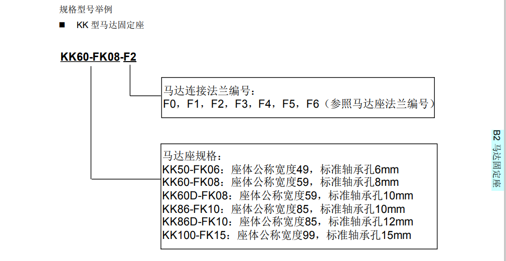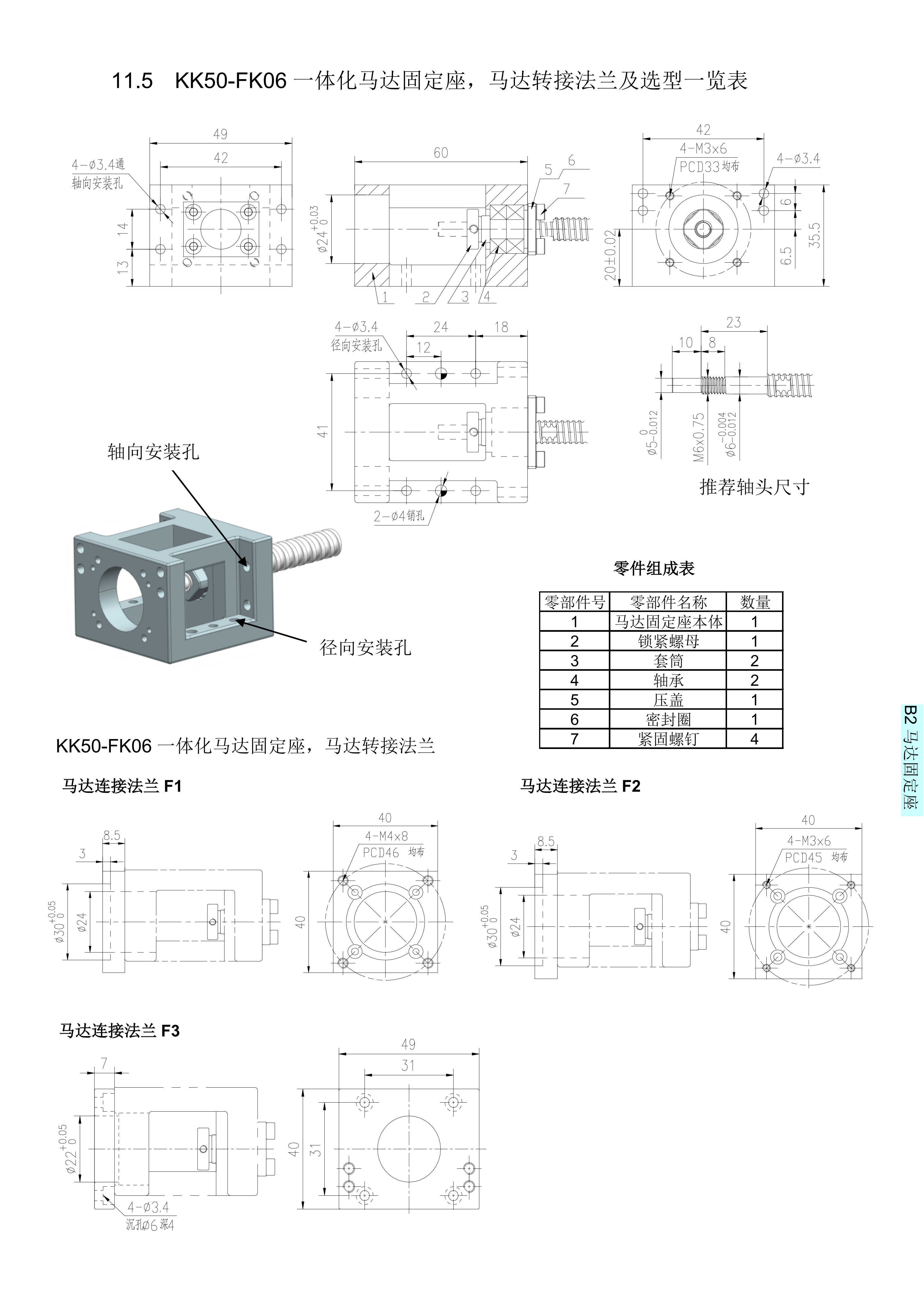 公司研發(fā)和生產(chǎn)的馬達(dá)固定座,馬達(dá)端可適應(yīng)松下,三菱,臺(tái)達(dá),東方等著名廠商的伺服馬達(dá)/步進(jìn)馬達(dá),軸承座一端適用國(guó)際標(biāo)準(zhǔn)化軸承座,從而,馬達(dá)安裝與滾珠絲杠可保證同心,提高安裝效率與安裝質(zhì)量。A型,B型,C型,H型,L型與臺(tái)灣嵩陽(yáng)SYK相應(yīng)型號(hào)通用;KK型等同臺(tái)灣上銀KK系列,PMI之KM系列,日本THK之KR/SKR等線性模的固定端。KK50-FK06一體化馬達(dá)座具體型號(hào):KK50-FK06-F1、KK50-FK06-F2、KK50-FK06-F3。